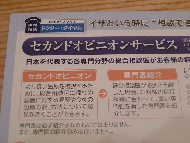 私が加入した終身医療保険であるメットライフ生命の「新終身医療保険」には「ドクターダイヤル」というセカンドオピニオンサービスがついています。